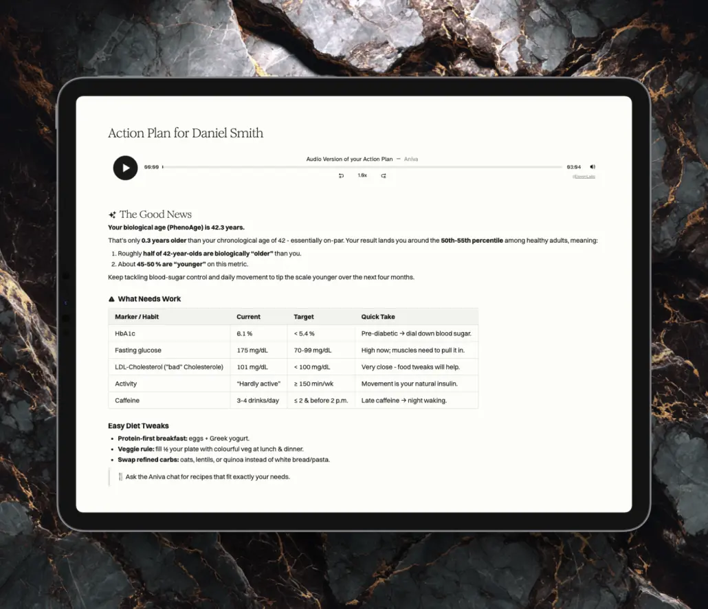 Your Aniva Action Plan is like having a personal health coach—but smarter, data-driven, and built for you. Once your blood test results are ready, we turn all that data into a super clear, personal action plan: